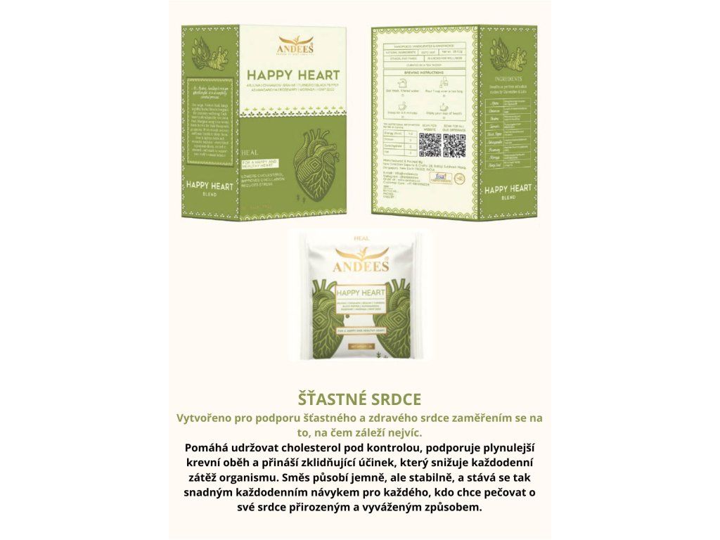 Pečlivě vytvořená bylinná směs ANDEES Happy Heart podporuje přirozenou péči o srdce a kardiovaskulární systém. Kombinace tradičních rostlin jako arjuna, brahmi, ashwagandha, kurkuma či moringa pomáhá udržovat cholesterol pod kontrolou, podporuje krevní oběh a přispívá k celkovému zklidnění organismu. Jemná chuť a vyvážené složení dělají z tohoto čaje ideální každodenní rituál pro péči o srdce.
